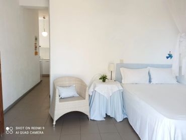 This apartment has a double bed in the front part, and in the back side a kitchen with fridge, coffee machine and the ensuite bathroom. The apartment is decorated simply with the colors white and sky blue. It is ideal for a couple, as the bed is double. The bathroom is in the same colors, small but cozy. There you will find clean, soft towels, shampoo, conditioner and shower gel for your personal use.